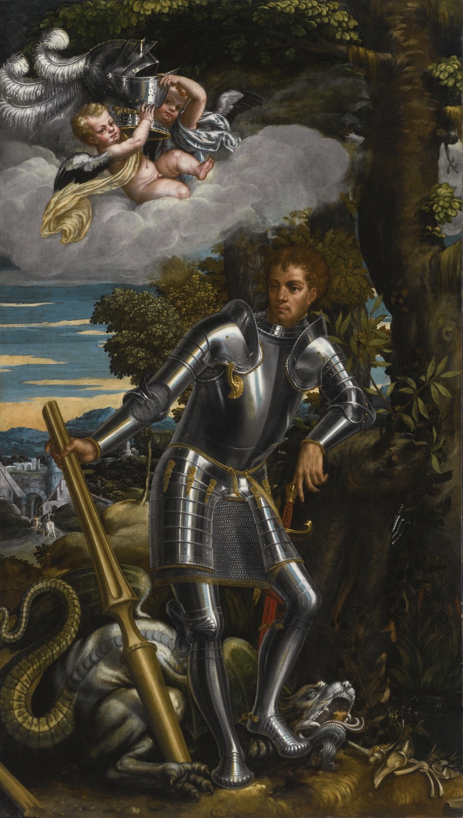 Amigoni takes his subject from Torquato Tasso’s Gerusalemme Liberata, an epic poem completed in 1575 Tasso’s poem recounts tales from the first crusade, culminating in Godfrey de Bouillon’s liberation of Jerusalem in 1099. The episode selected by the artist is an account from Book II, in which a female mercenary, Clorinda, dramatically rescues two Christian lovers from burning at the stake. In the painting we see Sophronia, a Christian accused of desecrating an Islamic image, sentenced to death by the Saracens and lashed to the stake with her lover, Olindo, who has chosen to die by her side. A Saracen, poised to ignite the pyre, is interrupted by the arrival of the Persian Clorinda, in full armour, who rides in on a white stallion, to the evident surprise of the Saracen king at left. More Clorinda