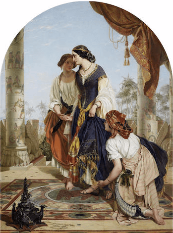 And glittering in royal robes…she took two maids with her; and upon one of them she leaned