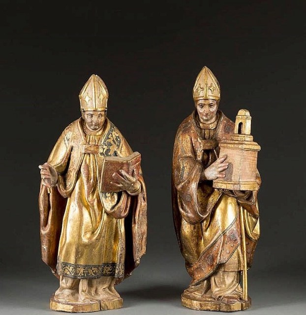 Two Fathers dressed in liturgical vestments with corresponding attributes: Cast and gospel book or a cathedral. More