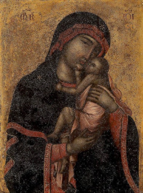The Cambrai Madonna (or Notre-Dame de Grace) is a small c 1340 Italo-Byzantine, possibly Sienese, replica of an Eleusa (Virgin of Tenderness) icon (below). The work on which it is based is believed to have originated in Tuscany c. 1300, and influenced a wide number of paintings from the following century as well as Florentine sculptures from the 1440–1450s. This version was in turn widely copied across Italy and northern Europe during the 14th and 15th centuries; Filippo Lippi’s 1447 The Madonna and Child Enthroned is a well known example.