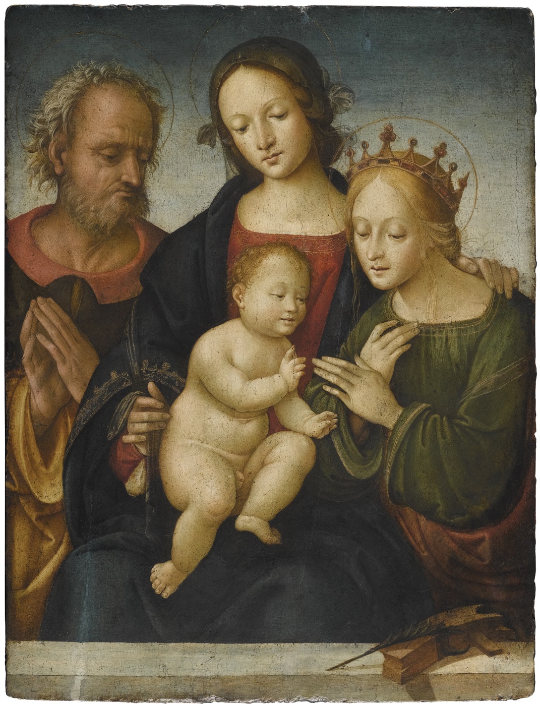 This Renaissance panel depicting the Mystic Marriage of Saint Catherine has thus far eluded secure attribution. The high cheek bones of the female figures’ graceful physiognomies imply that the work was evidently painted by an artist closely aware of the work of Pietro Perugino, probably in central Italy, but the lively figure of Joseph also pays homage to Filippino Lippi. More about this Icon