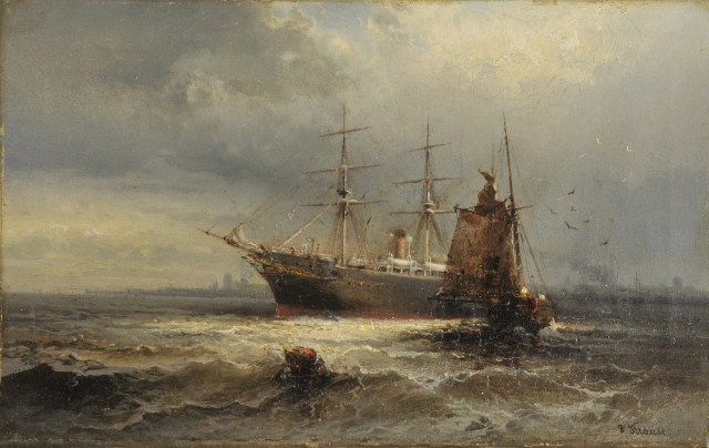 Edward William Cooke, R.A., F.R.S., F.Z.S., F.S.A., F.G.S. (27 March 1811 – 4 January 1880) was an English landscape and marine painter, and gardener. Cooke was born in Pentonville, London. He was raised in the company of artists. He was a precocious draughtsman and a skilled engraver from an early age, displayed an equal preference for marine subjects and published his “Shipping and Craft” – a series of accomplished engravings – when he was 18, in 1829. Cooke began painting in oils in 1833, and first exhibited at the Royal Academy and British Institution in 1835, by which time his style was essentially formed.