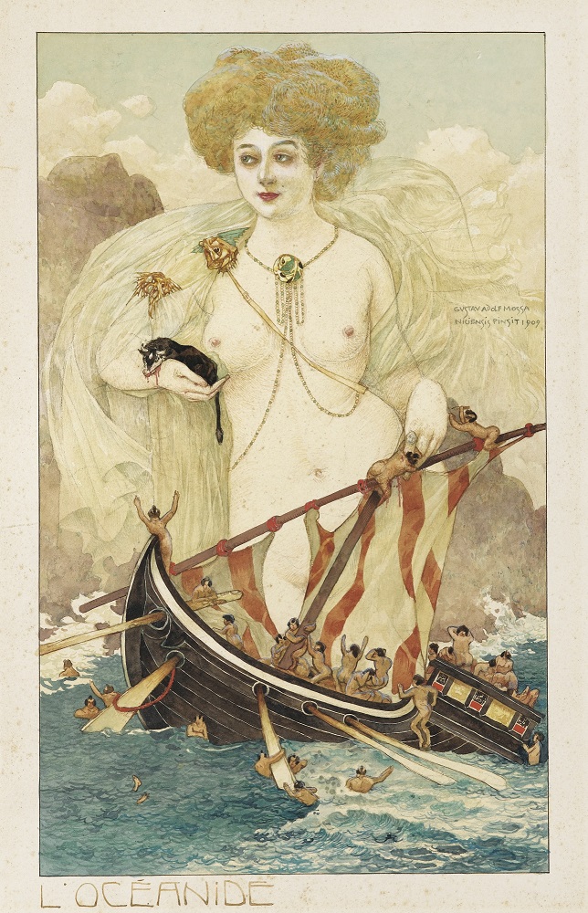 Water nymphs are usually known as guardians of water spots. However, Mossa’s water nymph is here drowning a ship full of naked sailors, panicking.