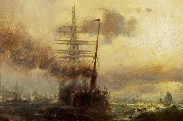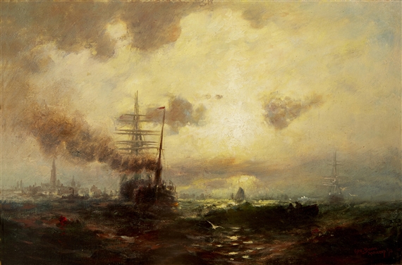 George Bunn (fl.1885 – 1898) was an American artist known for marine painting and commercial art, he was born in Brussels and moved by his family to Utica, New York, remained primarily in New York State until 1885, when he returned to Brussels. At age 15, he enlisted in a New York cavalry as a bugler to serve in the Civil War, and received a head wound that affected the remainder of his life. After leaving the Army, he served on the ship, Pensacola, in the Pacific Ocean, and then returned to Utica where he set up a sign painting business. In his leisure he did marine painting, which he sold locally. More George Bunn