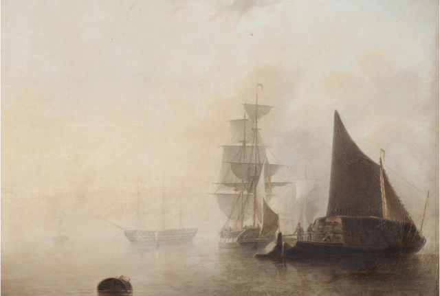 Luny left Holman’s studio in 1780. It was around this time that Luny was frequently exhibiting at the Royal Academy, in a total of twenty-nine exhibitions between 1780 and 1802. In Leadenhall Street, Luny became acquainted with a “Mr. Merle”, a dealer and framer of paintings who promoted Luny’s paintings for over twenty years, to great success. Luny also found a wealthy source of business in Leadenhall Street, where the British East India Company had their headquarters; their officers commissioned many paintings and portraits from Luny. Luny was occasionally invited as a guest on the Company’s ships on special occasions and voyages.