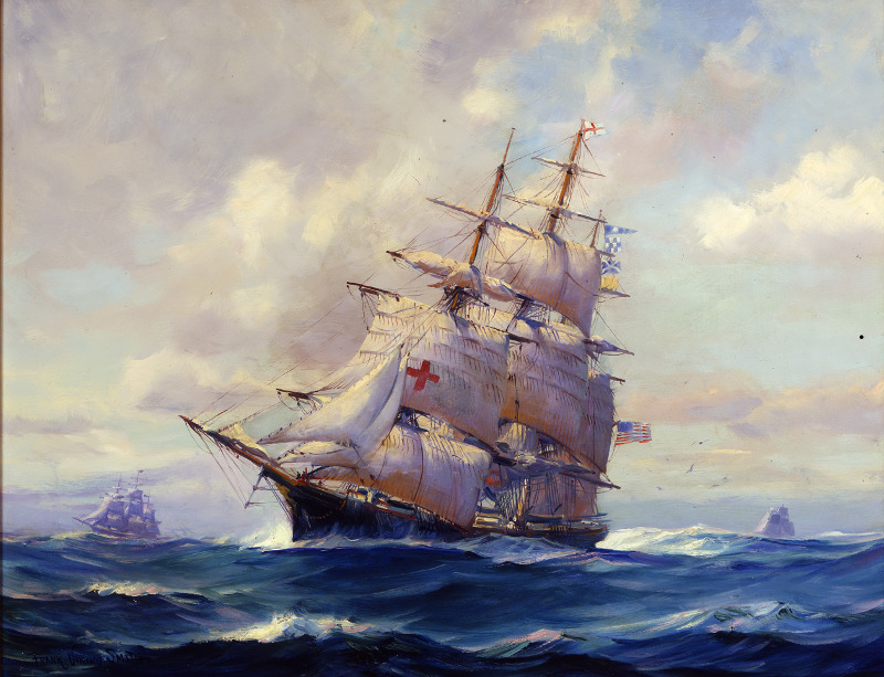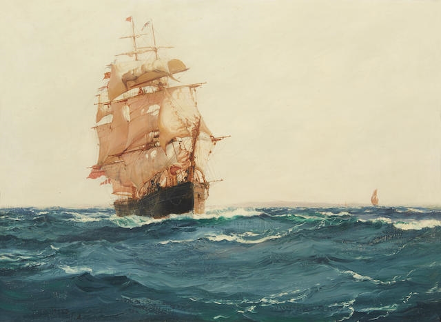 Montague Dawson RMSA, FRSA (1890–1973) was a British painter who was renowned as a maritime artist. His most famous paintings depict sailing ships, usually clippers or warships of the 18th and 19th centuries. Montague was the son of a keen yachtsman and the grandson of the marine painter Henry Dawson (1811–1878), born in Chiswick, London. Much of his childhood was spent on Southampton Water where he was able to indulge his interest in the study of ships. For a brief period around 1910 Dawson worked for a commercial art studio in Bedford Row, London, but with the outbreak of the First World War he joined the Royal Navy. Whilst serving with the Navy in Falmouth he met Charles Napier Hemy (1841–1917), who considerably influenced his work. In 1924 Dawson was the official artist for an Expedition to the South Seas by the steam yacht St.George. During the expedition he provided illustrated reports to the Graphic magazine.