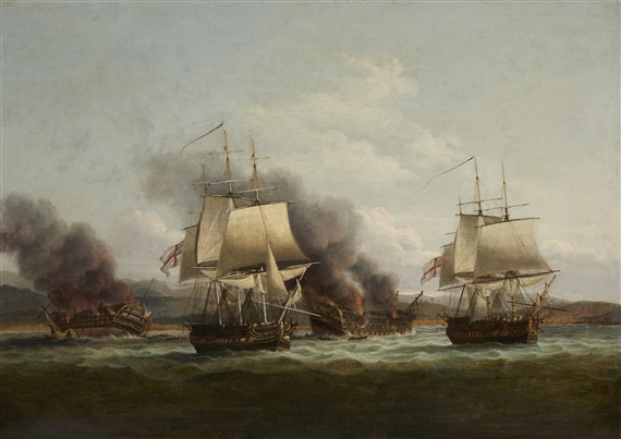 Luny left Holman’s studio in 1780. It was around this time that Luny was frequently exhibiting at the Royal Academy, in a total of twenty-nine exhibitions between 1780 and 1802. In Leadenhall Street, Luny became acquainted with a “Mr. Merle”, a dealer and framer of paintings who promoted Luny’s paintings for over twenty years, to great success. Luny also found a wealthy source of business in Leadenhall Street, where the British East India Company had their headquarters; their officers commissioned many paintings and portraits from Luny. Luny was occasionally invited as a guest on the Company’s ships on special occasions and voyages.