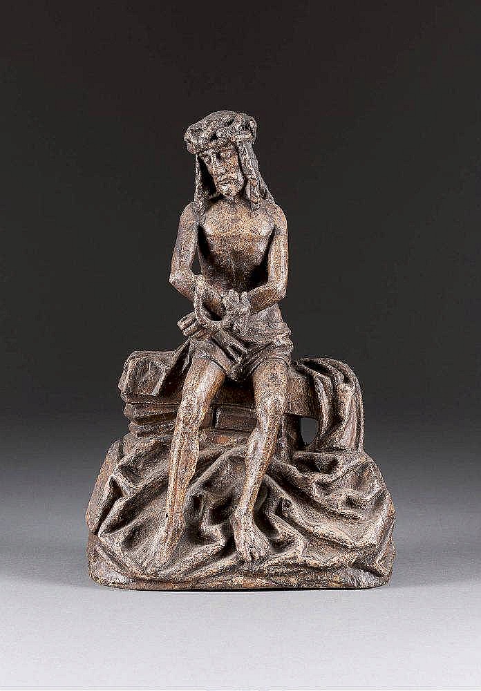 Christ as a man in pain, sitting on a covered wall. His hands are tied, on his head he wears a crown of thorns.