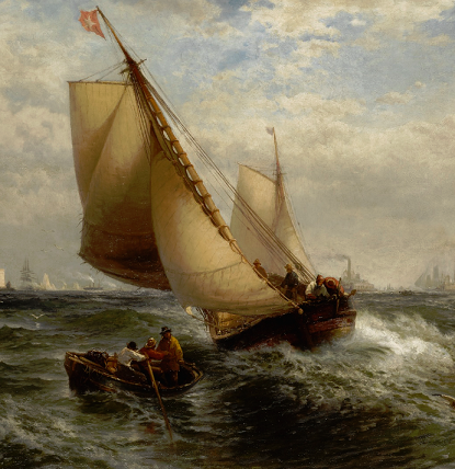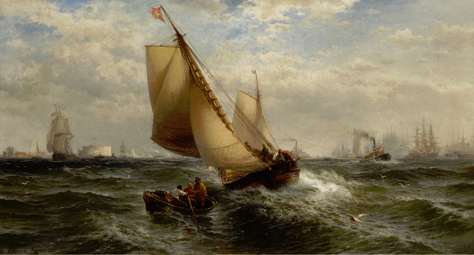 Edward Moran (August 19, 1829 in Bolton, Lancashire, England – June 8, 1901 in New York City) was an American artist of maritime paintings. Moran was born in England on August 19, 1829. Following in the footsteps of his father’s profession, he learned to operate a hand-loom at a young age, though he would often be found sketching with charcoal on the white fabric instead of plying the shuttle. His family first emigrated to Maryland in 1844, and then to Philadelphia a year later.