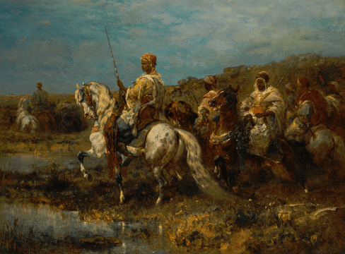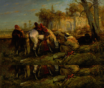 Adolf Schreyer (July 9, 1828 Frankfurt-am-Main – July 29, 1899 Kronberg im Taunus) was a German painter, associated with the Düsseldorf school of painting. He studied art, first at the Städel Institute in his native town, and then at Stuttgart and Munich. He painted many of his favourite subjects in his travels in the East. He first accompanied Maximilian Karl, 6th Prince of Thurn and Taxis through Hungary, Wallachia, Russia and Turkey; then, in 1854, he followed the Austrian army across the Wallachian frontier. In 1856 he went to Egypt and Syria, and in 1861 to Algiers. In 1862 he settled in Paris, but returned to Germany in 1870; and settled at Cronberg near Frankfurt, where he died.