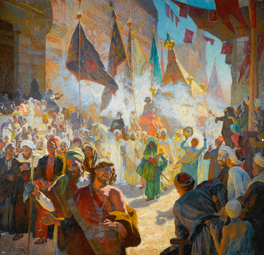 The procession of the title is wonderfully arranged. Foremost is a dervish, someone who follows a Sufi Muslim tariqa or path. These mendicant ascetics are known for their poverty and austerity. The man’s expressive features portray his participating emotion. Behind him follow other members of the religious community, identified by the colour of their turbans: dark green for the Rifa’iya order, red for the Ahmadiya order, and white for the followers of `Abd al-Qadir al-Jilani. With staves in their hands they fan in an arc towards the figure in green, probably a Sufi shaykh and presumably a Sharif, a descendant of the Prophet. This central figure is positioned directly below the Mahmal, the focus of the festive occasion, and a central part in the annual departure and return of the pilgrimage caravan. More Procession of the Mahmal.