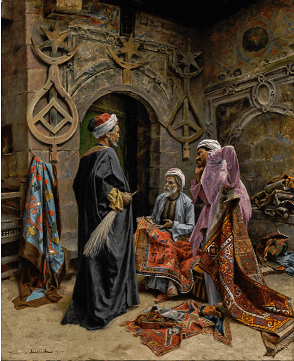 Mielich’s compositions of Cairene markets, bazaars and cafés offered contemporary audiences an exotic yet faithful view of Egyptian street life. Standing outside a mosque in the Haret el Yahoud district of the city, with the distinctive moon crescent and star motif and decked in wooden ‘alam finials (used as processional standards), three merchants engage in animated negotiation over a group of Moroccan rugs, Rabat, nineteenth-century, and others including kilims folded and stacked in the background. Hanging to the left of the doorway is a silk appliqué panel, Uzbekistan, nineteenth-century, with stylised geometric motifs and an azure blue ground and deep dark brown border. More the merchant