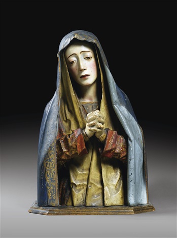 Carved wood sculpture, enhanced by paint and other media, including glass eyes and hair, reached a pinnacle of naturalism and expressive force in 17th-century Spain. Pedro de Mena’s virtuoso manipulation of these materials created startling likenesses of bodies and clothing. They encourage in the beholder an empathetic response. The Virgin’s thin, deeply undercut drapery are joined by the subtle and descriptive painting in thin glazes of the silver and red brocade of the Virgin’s tunic. Mena’s desire was to make the figures seem physically present before the viewer. At the same time, they have a dignity and reserve that made them ideal works for contemplation. More Pedro de Mena sculpture