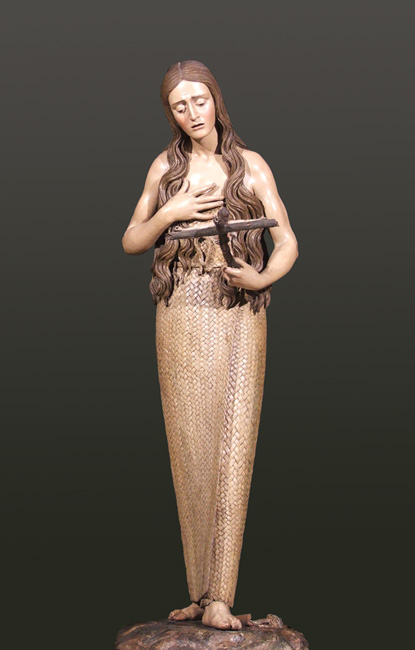 This is one of Mena’s most personal creations and a masterpiece of Spanish sculpture thanks to the masterly fusion of naturalistic polychromy, skilled sculpting and expression of repentance. Wrapped in a mat of woven palm, her face marked by penance, the holy penitent turns her gaze to the crucifix as her hand draws a gesture of mystical ecstasy. More Mary Magdalene Penitent