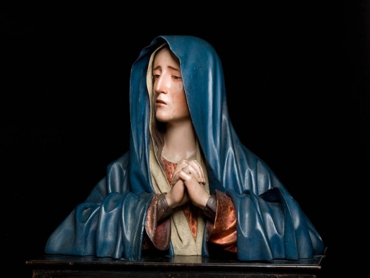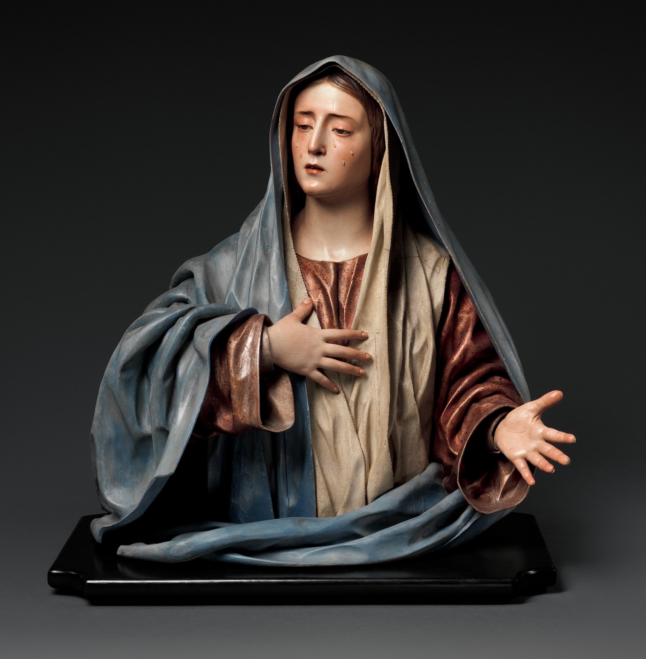 Just under life size at 33.6cm tall, the Virgin of Sorrows’ gently furrowed brows, natural flesh tones, glass eyes and teardrops and eyelashes made from human hair, still elicit a powerful response from the viewer 350 years after it was made. It was most likely created for the private chapel, study or bedchamber of a devout patron, and would almost certainly have been protected under a glass dome. More The Virgin of Sorrows