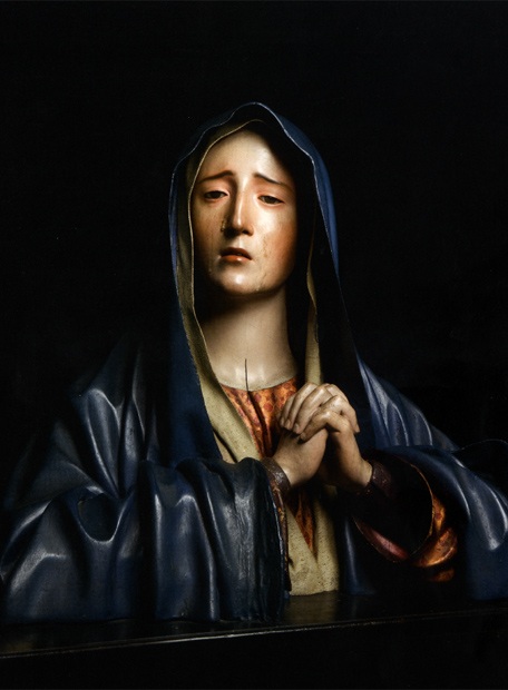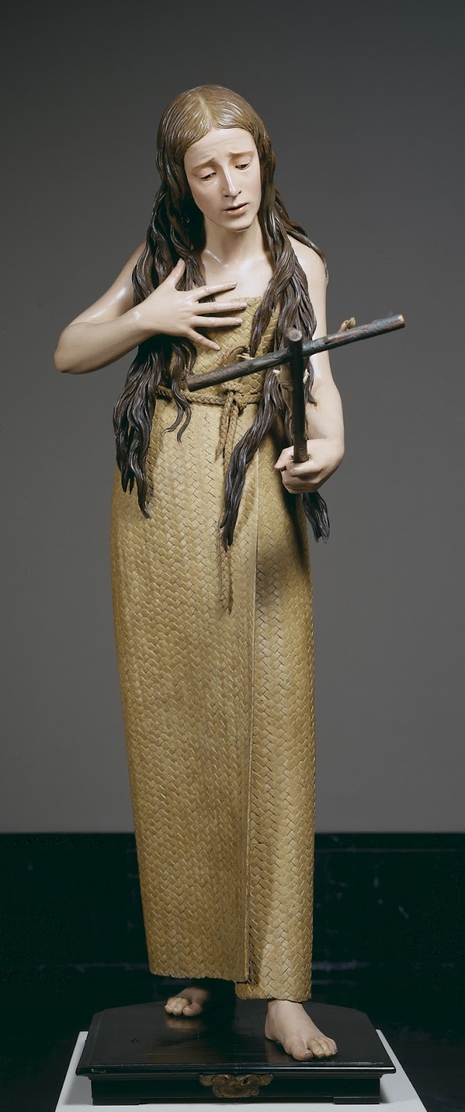 This is one of Mena’s most personal creations and a masterpiece of Spanish sculpture thanks to the masterly fusion of naturalistic polychromy, skilled sculpting and expression of repentance. Wrapped in a mat of woven palm, her face marked by penance, the holy penitent turns her gaze to the crucifix as her hand draws a gesture of mystical ecstasy. More Mary Magdalene Penitent