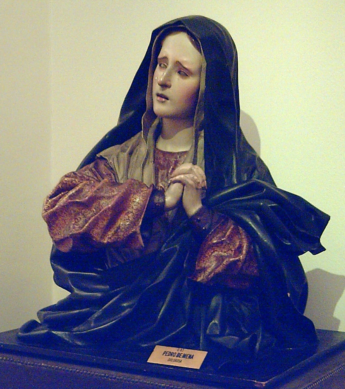 Between 1673 and 1678 Pedro de Mena carved the half-bust polychrome, of fine sheets that give great plasticity and movement to the folds, incorporating buttons, borders, teeth of ivory, horn nails and eyes of vitreous paste that give a great verisimilitude. It is in a window, with central window and other narrower sides.