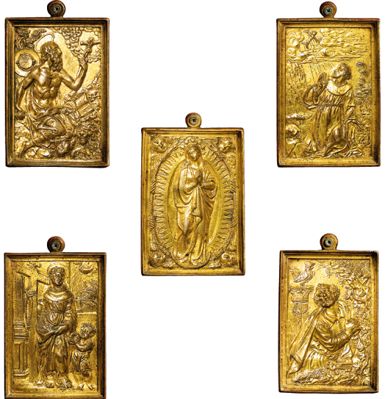 five gilt bronze plates, on a red velvet background; In the same gilt wood frame