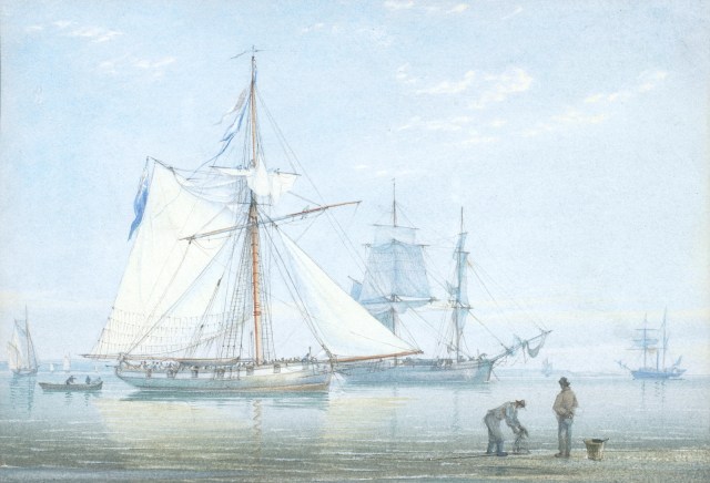 Edward William Cooke, R.A., F.R.S., F.Z.S., F.S.A., F.G.S. (27 March 1811 – 4 January 1880) was an English landscape and marine painter, and gardener. Cooke was born in Pentonville, London. He was raised in the company of artists. He was a precocious draughtsman and a skilled engraver from an early age, displayed an equal preference for marine subjects and published his “Shipping and Craft” – a series of accomplished engravings – when he was 18, in 1829. Cooke began painting in oils in 1833, and first exhibited at the Royal Academy and British Institution in 1835, by which time his style was essentially formed.