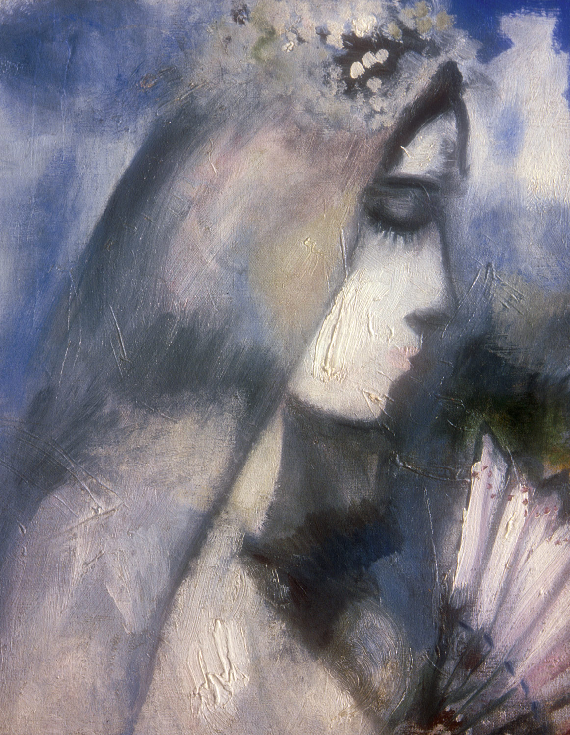 Marc Chagall conjured up his native Russia in the works he painted from 1910 to 1914 while he was living in the French capital. Similarly, in the small painting The Betrothed, he evoked his far-away fiancée Bella Rosenfeld, whom he would marry in 1915 upon his return to Vitebsk, Russia. The picture’s palette of only blue and white is unusual within the artist’s oeuvre, yet the brighter colors showing through the white paint suggest that Chagall reused an old canvas. Pierre Matisse, the son of artist Henri Matisse, had coveted the works of Chagall since 1924, when he first met the artist in Paris. Chagall was loath to part with his work, but in 1941 Pierre, who then owned an art gallery in New York, was able to mount an exhibition of Chagall’s work that became a “blockbuster”; this was followed by sixteen more exhibitions at the gallery through 1982. More Bride with Fan