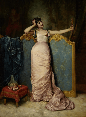 Toulmouche is best known for his depictions of richly clad women set against the backdrop of luxurious interiors. His paintings have been called “elegant trifles” and the ladies who feature in them have been referred to as “Toulmouche’s delicious dolls.” One critic even compared the interiors of a Toulmouche painting to daintily decorated jewel boxes.