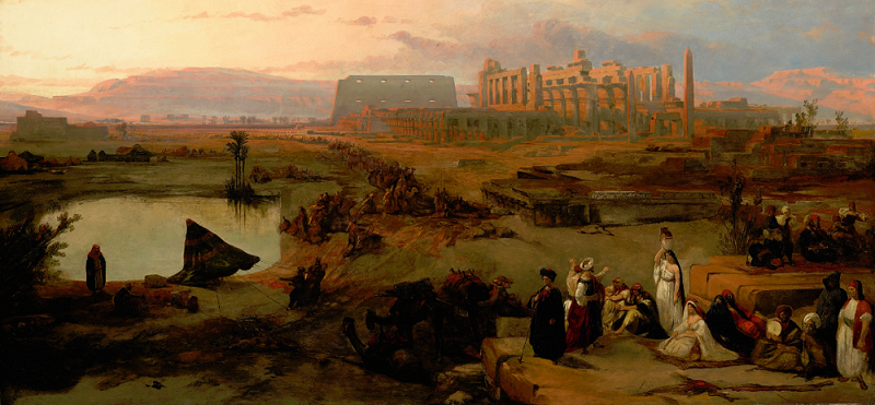 In 1845 when his reputation was at its zenith, Roberts exhibited the present picture, one of his largest paintings to be shown at the Royal Academy. Its full title was given in the catalogue, Ruins of the Great Temple of Karnak, in Upper Egypt, Looking Towards the Libyan Chain of Hills, Called Baban el Malouk (the Gate of the Kings) in which the Excavated Tombs of the King of Thebes – Sunset. “Karnac is one of the Five Great Temples still Left of Thebes, the Ancient Capital of Upper Egypt. Profane History is Silent in Respect to it, and Records Only its Capture by Cambyses, King of Persia, son of Cyrus the Great, in the Year 526 B.C., and of its Final Destruction by Ptolomy Lathyrus, After a Protracted Siege of Three Years, 81 B.C. More Great Temple of Karnak