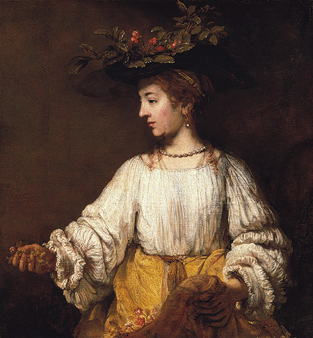 Although pictures of Flora by Titian and other Italian artists ultimately inspired this work, Rembrandt rejects their idealizing approach by treating the goddess of Spring as an ordinary woman in fancy dress, with an expression betraying real experience. She seems to understand that flowers—emblematic of youth, beauty, and love—will fade away. The figure’s face and pose are based partly on a portrait of Rembrandt’s wife, Saskia, who died in 1642. While the paint surface is abraded, its quality is clear in the billowing folds of the blouse and the flower-filled apron. More Rembrandt Flora, circa 1654