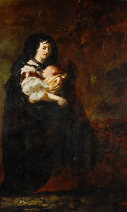 The present painting shows the 15-year-old Elisabeth, Duchess in Bavaria and future Empress of Austria, in front of Possenhofen Castle with Lake Starnberg in the background. Here, she could spend untroubled childhood summers, far from the Munich court. The painting, dated 1853, was executed in the year of her engagement with the Austrian Emperor Franz Joseph I. Empress Elisabeth gave the portrait to Francis Joseph of Austria for Christmas after the two were engaged to be married. More on this Painting