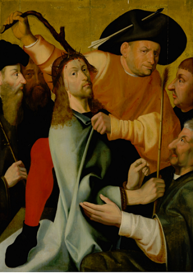 The composition derives from Hieronymus Bosch’s Christ Mocked (circa 1510, National Gallery, London). Other versions can be found in the Philadelphia Museum of Art and the Royal Museum of Fine Arts, Antwerp.