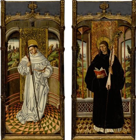 The two saints depicted are thought to be Benedict of Nursia (in black) and Bernard of Clairvaux (in white). Saint Benedict was the founder of the Benedictine order, the oldest Western monastic order. Saint Bernard was a Cistercian monk and theologian. The Cistercian order was a reformed offshoot of the Benedictines whose goal was to adhere more closely to monastic life as originally dictated by Saint Benedict. More on the two saints