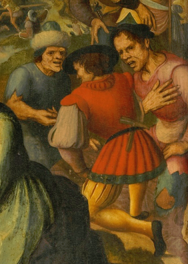 A group of figures to the right, fighting over Saint Joseph’s mantle