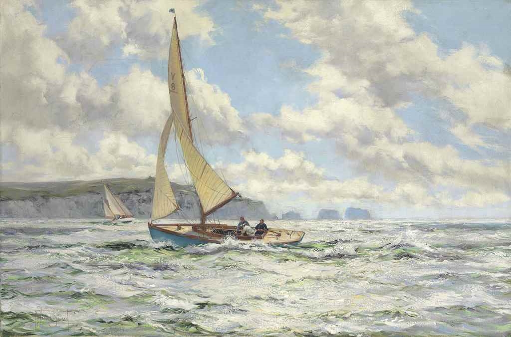 Montague Dawson RMSA, FRSA (1890–1973) was a British painter who was renowned as a maritime artist. His most famous paintings depict sailing ships, usually clippers or warships of the 18th and 19th centuries. Montague was the son of a keen yachtsman and the grandson of the marine painter Henry Dawson (1811–1878), born in Chiswick, London. Much of his childhood was spent on Southampton Water where he was able to indulge his interest in the study of ships. For a brief period around 1910 Dawson worked for a commercial art studio in Bedford Row, London, but with the outbreak of the First World War he joined the Royal Navy. Whilst serving with the Navy in Falmouth he met Charles Napier Hemy (1841–1917), who considerably influenced his work. In 1924 Dawson was the official artist for an Expedition to the South Seas by the steam yacht St.George. During the expedition he provided illustrated reports to the Graphic magazine.