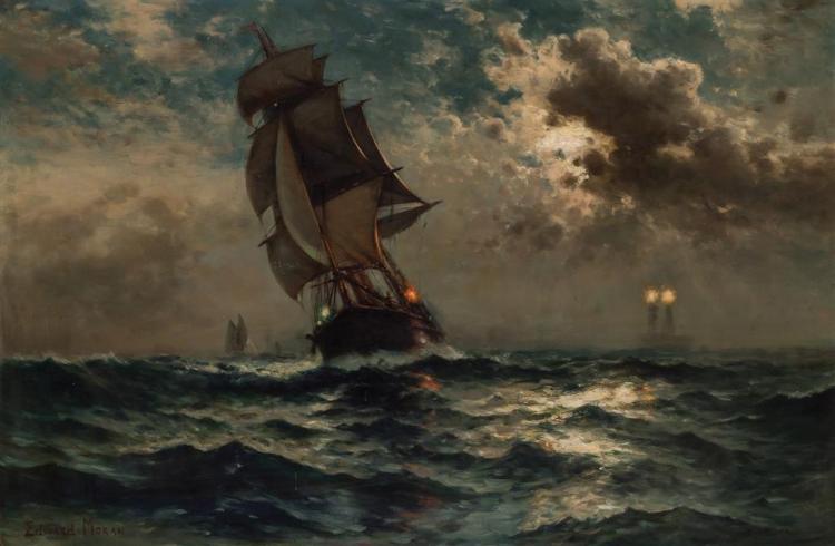 Edward Moran (August 19, 1829 in Bolton, Lancashire, England – June 8, 1901 in New York City) was an American artist of maritime paintings. Moran was born in England on August 19, 1829. Following in the footsteps of his father’s profession, he learned to operate a hand-loom at a young age, though he would often be found sketching with charcoal on the white fabric instead of plying the shuttle. His family first emigrated to Maryland in 1844, and then to Philadelphia a year later.