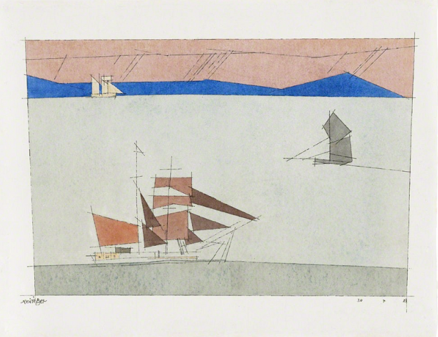 Though originally from New York, Lyonel Feininger spent a great deal of his career in Germany and is closely associated with the German Expressionist movement as well as the Bauhaus, where he was an active teacher and practitioner. Early Cubism and Futurism acted as significant sources of inspiration in the development of Feininger’s personal style, characterized by angular lines and transparent intersecting planes. When the Bauhaus was dissolved by the Nazi party in the late 1930s, Feininger returned to his native New York, adding a series of skylines and seascapes to his already prolific body of work.