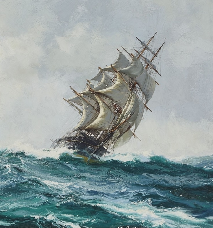 Montague Dawson RMSA, FRSA (1890–1973) was a British painter who was renowned as a maritime artist. His most famous paintings depict sailing ships, usually clippers or warships of the 18th and 19th centuries. Montague was the son of a keen yachtsman and the grandson of the marine painter Henry Dawson (1811–1878), born in Chiswick, London. Much of his childhood was spent on Southampton Water where he was able to indulge his interest in the study of ships. For a brief period around 1910 Dawson worked for a commercial art studio in Bedford Row, London, but with the outbreak of the First World War he joined the Royal Navy. Whilst serving with the Navy in Falmouth he met Charles Napier Hemy (1841–1917), who considerably influenced his work. In 1924 Dawson was the official artist for an Expedition to the South Seas by the steam yacht St.George. During the expedition he provided illustrated reports to the Graphic magazine.