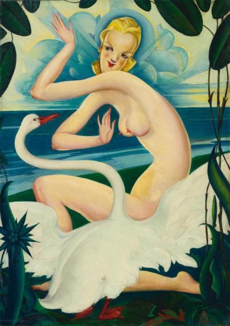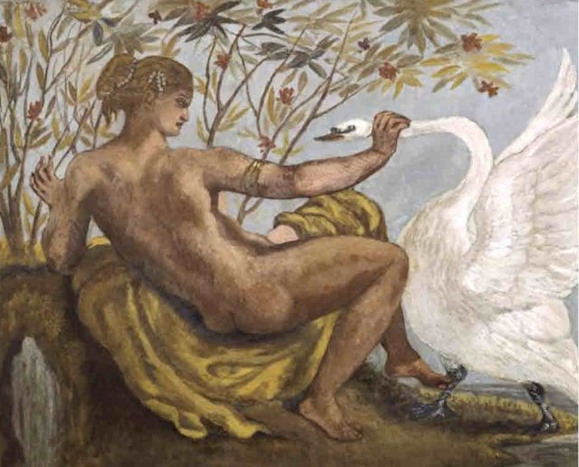Leda and the Swan is a story and subject in art from Greek mythology in which the god Zeus, or Jupiter, in the Roman version, in the form of a swan, seduces or rapes Leda, the daughter of the King of Aetolia, and married to the Spartan King Tyndareus. According to later Greek mythology, Leda bore Helen and Polydeuces, children of Zeus, while at the same time bearing Castor and Clytemnestra, children of her husband Tyndareus, the King of Sparta.