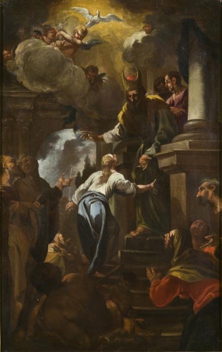 He settled in Naples in 1674, there he worked in the studio of Francesco di Maria and later Giacomo del Po. He apparently had taken the clerical orders, but was patronized early on, and encouraged to become an artist by Cardinal Vincenzo Orsini (later Pope Benedict XIII). By the 1680s, he had independent fresco commissions, and his active studio came to dominate Neapolitan painting from the 1690s through the first four decades of the 18th century. He modeled his art—for he was a highly conventional painter—after the Roman Baroque masters. Solimena painted many frescoes in Naples, altarpieces, celebrations of weddings and courtly occasions, mythological subjects, characteristically chosen for their theatrical drama, and portraits. His settings are suggested with a few details—steps, archways, balustrades, columns—concentrating attention on figures and their draperies, caught in pools and shafts of light. Art historians take pleasure in identifying the models he imitated or adapted in his compositions. His numerous preparatory drawings often mix media, combining pen-and-ink, chalk and watercolor washes. More on Francesco Solimena