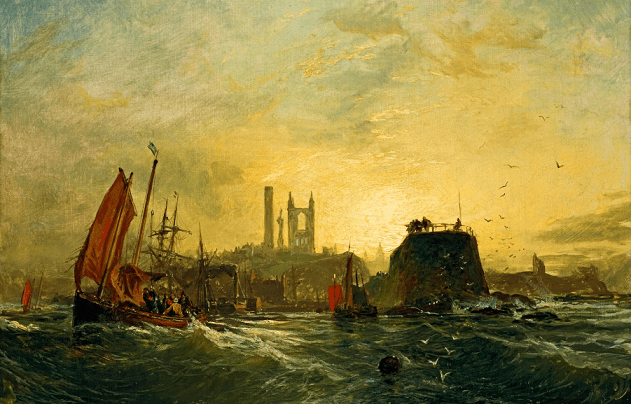 This dramatically lit scene shows a view just off the harbour of St Andrews, looking back towards the town. The remains of the ruined Cathedral can be seen perched on the hill. They form a backdrop to the foreground drama of the fishing boat venturing out into the turbulent waters of St Andrews Bay, notorious for its heavy swell and frequent shipwrecks. Benefitting from improvements in rail connections across Scotland, Bough made frequent excursions to the coastal towns and villages of the East Neuk of Fife from the 1850s to the 1870s. This painting was completed in 1856, the same year that Bough was elected an Associate of the Royal Scottish Academy. More on this painting