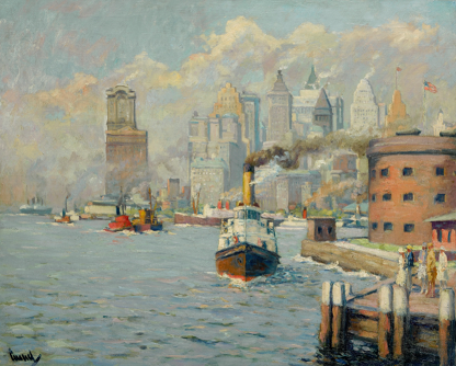 In the present picture Cucuel illustrates southern Manhattan from a vantage point on Governor’s Island. At right is Castle Williams, a circular fortification on the northwest point of the island and part of a system of forts constructed in the early 19th century to protect New York City from naval attack. Other structures visible in the skyline include the Woolworth Building, the International Mercantile Marine Company and the Whitehall Building. More on this painting
