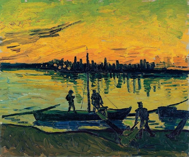 The impression this sight made on the artist spurred him to depict it shortly afterwards in three paintings. The first of them, Boats with Sand (above), features two moored boats viewed from a very oblique, high perspective, as if captured from a very tall quay from which some men unload sand, not coal, in full daylight. Later, perhaps at the end of August, he painted two similar pictures (below), this time showing the sunset: Coal Barges and the Museo Thyssen-Bornemisza Stevedores in Arles. More on van Gogh in Arles