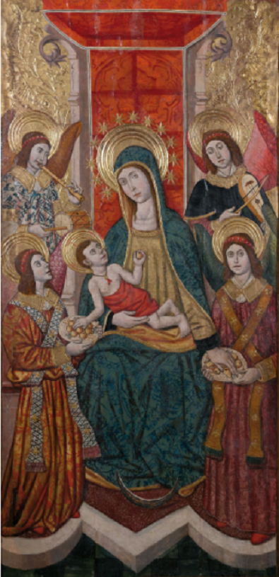Mary is enthroned with the Christ Child on her knees, surrounded by angels. One of these offers Mary a plate of fruit, Jesus is holding a piece of fruit from another plate and offering it to His mother. At their feet a quarter waxing moon evokes the astral attributes that often accompany the Virgin. As Albert Velasco points out: “The throne has a complex structure with base and uprights topped with a bed-canopy shaped structure… Four angels dressed as deacons are placed around the throne, two are standing holding the trays of fruits, and two more at the back are playing musical instruments.”