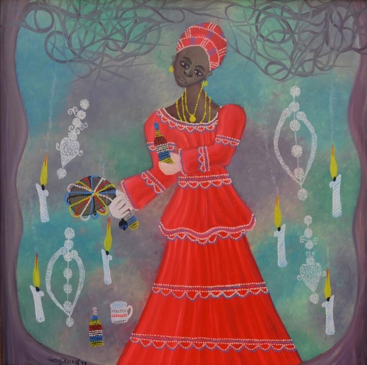 Rocher began to paint at the age of 12 or 13 under the patronage of the renowned artist Calixte Henry. Rocher’s goal was to bear witness to his deeply engrained Vodou culture. More on Camy Rocher
