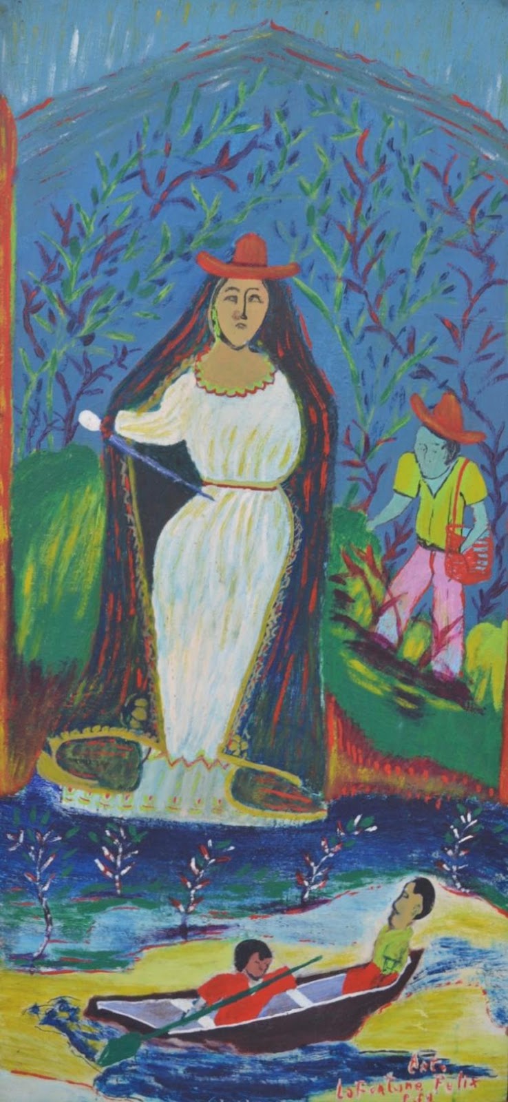 Felix draws his content from his knowledge of and concern with the supernatural. His self-assured, forceful personality and the power of his vision endow his work with an intensity. Very temperamental by nature, Felix portrays highly active scenes. There is drama and breathless wonder in his dynamic brushwork. His preference for strong color betrays the origin of his pictorial perception: the need and desire to impress the worshipper as well as the loas. More on Lafortune Felix