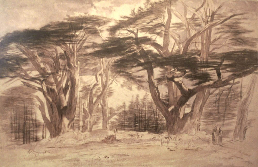 Although Lear had travelled in the Middle East, and indeed undertook his most extensive tour there in 1858, his time was limited. As in the case of other pictures, he found he still needed a more leisurely contemplation in order to work up his landscapes: “Individual foreground details and studies of foliage were often painted from local sources”. Thus, to complete a view of the Cedars of Lebanon that had so impressed him, he went looking for good specimens when home again in England. Fortunately, some such specimens were to be found within easy reach of London. Lear could hardly have done better than the ancient and famous cedar trees on the estate of the Oatlands Park Hotel in north Surrey. The most imposing one now has a sign on it, that reads, “This is one of the first Cedars of Lebanon imported into England. It is believed to have been planted here by Prince Henry Otelands [sic], the youngest son of King Charles the First.” More on The Cedars of Lebanon