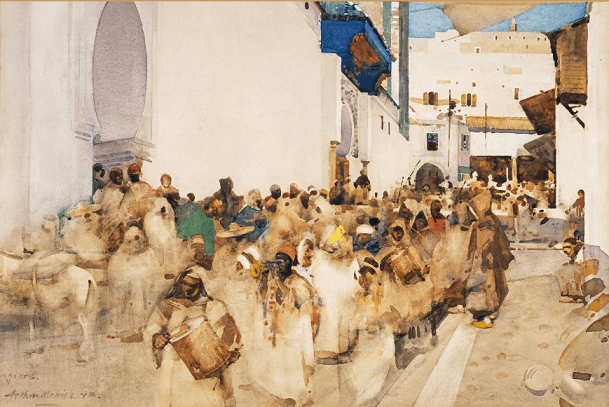 Melville conveys the atmospheric clamour of a local parade led by drummers and pipers. He evokes its exotic character, underlined by the colourful clothes and hooded cloaks of the participants, with his ‘blottesque’ technique. The resulting blurred edges and striking accents of pure colour, from pigment applied onto wet paper, suggest a wonderful sense of movement in brilliant sunlight. The vibrant city of Tangier attracted many artists, and Melville, inspired by his friend the painter Joseph Crawhall, visited it twice in the spring of 1890 and 1893. More on this painting
