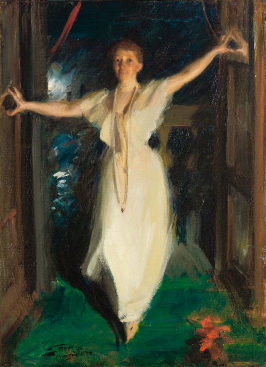 While visiting the Gardners in Boston in February 1894, Anders Zorn made an etching of Mrs. Gardner, which neither of them considered to be a complete success. Later that year Zorn and his wife visited the Gardners in Venice, staying for several weeks as their guests in the Palazzo Barbaro. He attempted again to make a portrait of Mrs. Gardner, but continued to struggle with the task. One evening, Mrs. Gardner stepped out into the balcony to see what was happening outside, and as she came back into the drawing-room, pushing the French windows open, Zorn exclaimed (according to Morris Carter): “Stay just as you are! That is the way I want to paint you.” He went instantly for his materials, and then and there the portrait was begun. More on this painting