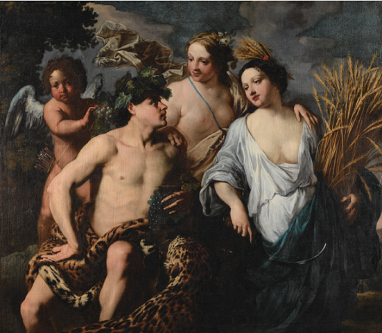 The theme of Sine Cerere et Baccho Friget Venus – literally, ‘without Ceres or Bacchus, Venus would freeze’ – is derived from a line in Act IV of The Eunuch, a Roman farce by a Roman dramatist Terence and explained by the 16th-century humanist Erasmus, this image illustrates the idea that food and drink, the gifts of Ceres and Bacchus, nourish desire, as embodied by Venus. Jan Miel united the three gods with reverberating reflections across the image. More on this image.