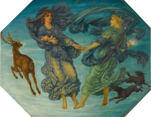 When the wood-nymph Eurydice was fatally bitten by a snake, her husband Orpheus, son of the Sun-god Apollo and the Muse Calliope, refused to accept her death and journeyed from his home in Thrace to the Underworld to regain her. After charming the deities Pluto and Proserpine with his beautiful music which had the power to tame wild beasts, Orpheus was permitted to lead Eurydice through the shadows back to the Earth. He was warned that he must not look back at her until they were in the daylight again. At the moment that they were about to emerge from Hades, Orpheus was consumed with temptation to see his wife and turned to see her disappear back into the darkness, losing her again and forever. This moment depicted in Watts dramatic painting. More on Orpheus and Eurydice