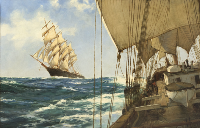 Montague Dawson RMSA, FRSA (1890–1973) was a British painter who was renowned as a maritime artist. His most famous paintings depict sailing ships, usually clippers or warships of the 18th and 19th centuries. Montague was the son of a keen yachtsman and the grandson of the marine painter Henry Dawson (1811–1878), born in Chiswick, London. Much of his childhood was spent on Southampton Water where he was able to indulge his interest in the study of ships. For a brief period around 1910 Dawson worked for a commercial art studio in Bedford Row, London, but with the outbreak of the First World War he joined the Royal Navy. Whilst serving with the Navy in Falmouth he met Charles Napier Hemy (1841–1917), who considerably influenced his work. In 1924 Dawson was the official artist for an Expedition to the South Seas by the steam yacht St.George. During the expedition he provided illustrated reports to the Graphic magazine.