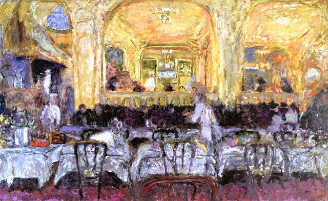 Usually the setting for a lighthearted scene of leisure, notably in the work of Pierre-Auguste Renoir, the painting’s outdoor café takes on a sober note in the low autumn light.